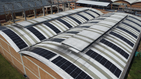 Solución: Proyecto integral con un sistema de 28,8 kWp, paneles Longi, inversor Chint Power y estructura Ralux. Se incluyó el reemplazo de cubierta de asbesto por standing seam + deck metálico con aislamiento PIR y membrana TPO, además de líneas de vida certificadas y reforzamiento estructural.